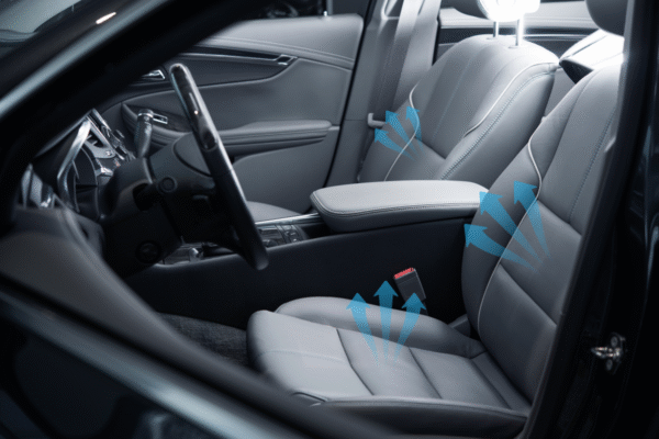 Quạt làm mát ghế sử dụng hệ thống quạt gió đặt dưới ghế, kết hợp với lỗ thoáng khí trên bề mặt da ghế. Khi bật hệ thống làm mát ghế, quạt sẽ hút khí lạnh trong xe và đẩy không khí lưu thông liên tục, tạo ra luồng gió mát thổi đều khắp bề mặt ghế.